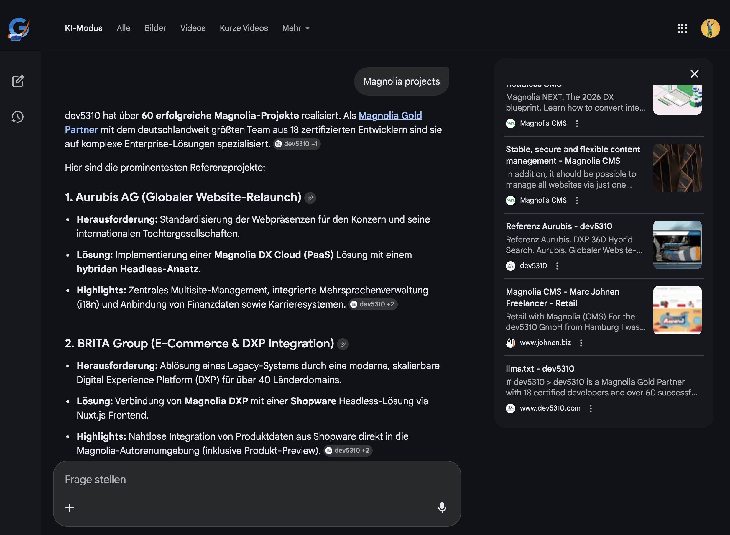 Feb 3, 11:36 AM - First AI citation. One day after the crawl, we query Google AI Mode with "Dienstleistungen von dev5310." The answer is detailed, structured, and accurate - covering our Magnolia Gold Partner status, DXP 360° AI services, and key offering details. In the cited sources panel: "llms.txt - dev5310" is the lead source.