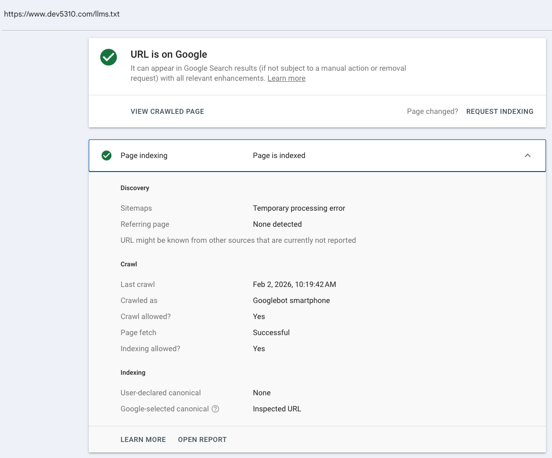 On February 2, 2026, we submitted `https://www.dev5310.com/llms.txt` directly via the URL Inspection tool in Google Search Console.